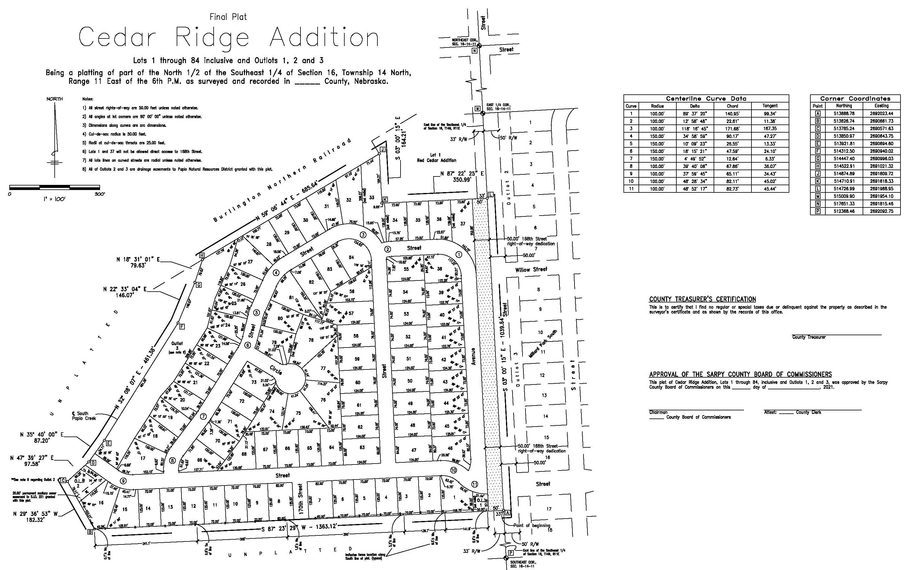 Also known as a “Subdivision Plat”, it is the subdivision of a tract of land into smaller parcels, showing monumentation and mathematical survey data on a map, conforming to local Government (usually County) ordinances.